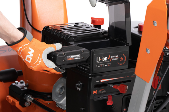 Благодаря установленному Li-ion аккумулятору на 21В, двигатель запускается простым нажатием кнопки на рукоятке управления. Обеспечивает легкий запуск холодного двигателя при любых температурах до -30˚C.