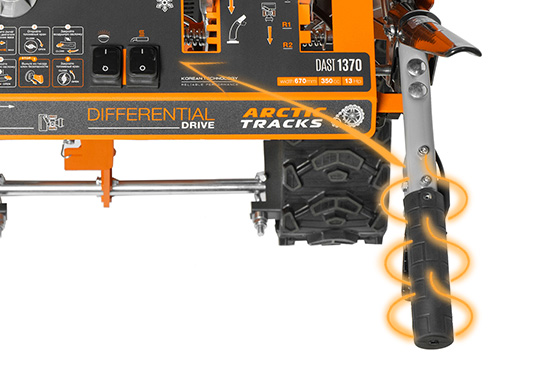 Автоматический дифференциал позволяет без усилий маневрировать снегоуборщиком на любых поверхностях, перебрасывая крутящий момент между колесами в зависимости от условий работы. При необходимости дифференциал можно разблокировать с помощью специального рычага.