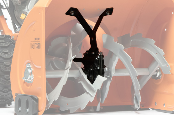 Усиленный редуктор с двумя дополнительными опорами передает до 95% крутящего момента двигателя. Срезные болты на шнеках защищают редуктор от перегрузок. Выходной вал редуктора крепится на подшипниках большого диаметра, что обеспечивает высокую устойчивость механизмов к вибрации и ударам.