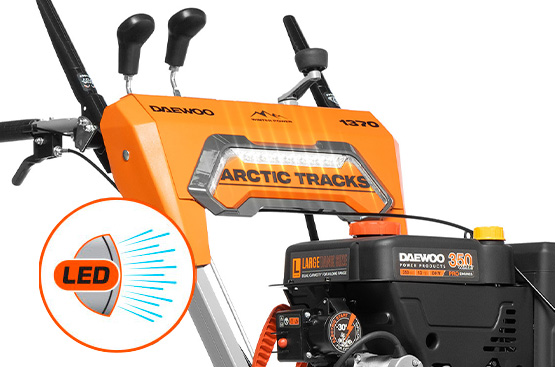 Яркая LED фара мощностью светового потока 280 лм обеспечивает освещение рабочей зоны перед снегоуборщиком, помогая работать в темное время суток.