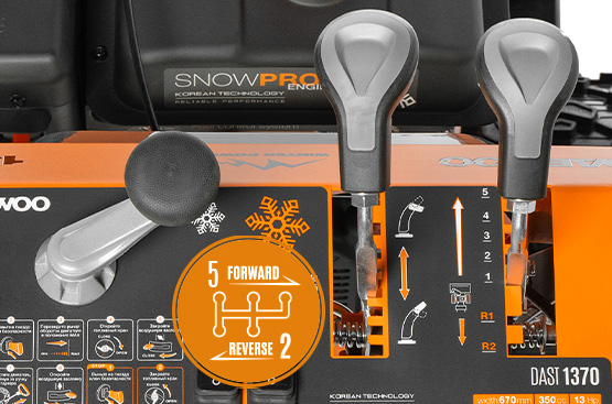 Система обеспечивает выбор скоростей: 5 скоростей вперед и 2 скорости назад, в зависимости от высоты снежного покрова. Простая и одновременно надежная система перемещения фрикционного диска для изменения скорости.