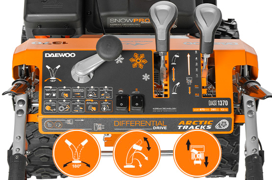 Изменение угла выброса на 180 градусов дает возможность мгновенно изменять направление и дальность выброса снега непосредственно с панели оператора.